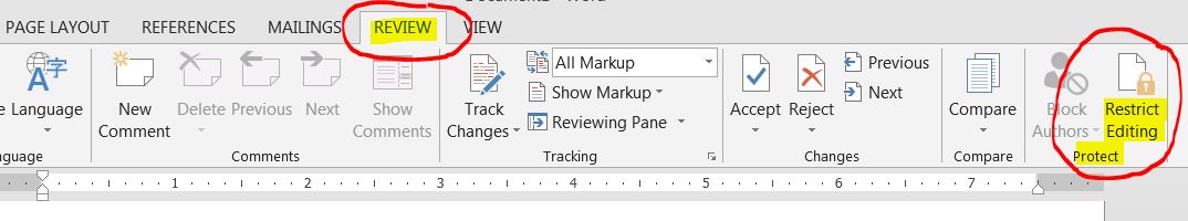 1. Click the REVIEW Tab of the ribbon to display the “Restrict Editing” tool, in the “Protect” group.
