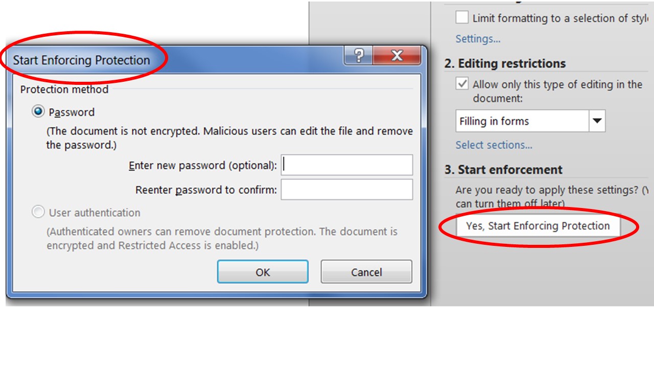 6. Back in the “Restrict Editing” task pane, Click “Yes, Start Enforcing Protection” button to display the “Start Enforcing Protection” dialog box.