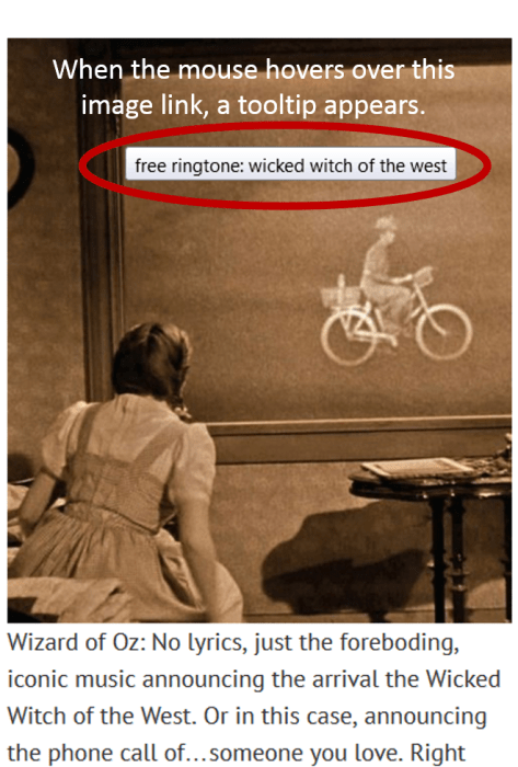 Here’s a little code snippet you can add to a link so that when someone hovers their mouse over the link, a “tooltip” is displayed, giving them more information. In the example shown below, the image of Dorothy looking out her window is a link to download an audio clip of the theme of the Wicked Witch. The tooltip I added displays the target post’s title “free ringtone: wicked witch of the west” when the mouse hovers over the image.