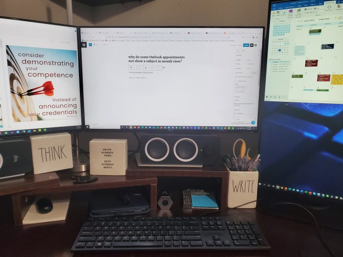 As a matter of everyday practice, when I’m not in an online meeting, my middle monitor is my main monitor. Straight in front of me, good ergonomics…all that. My left monitor is for reference or source material and my right, portrait monitor became home to my Outlook calendar and email.