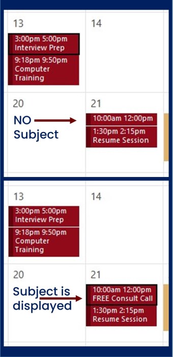 My default view for calendar is month view and I’ve been noticing that some of my appointments didn’t have a subject line. It happened again today. Weird. I opened the the appointment to see if it actually HAD a subject line. It did. Weird. I googled. Lots of search results about scheduling resources and…what you probably found before you stumbled upon this post.